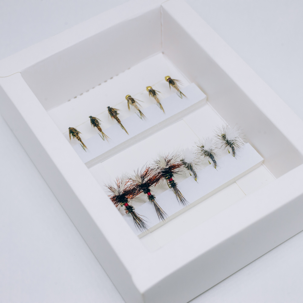 Selection of classic Australian flies in one box for various conditions. Royal Wulff for a faster type of water, and Klink Para Adams for slower pools. And different weight nymphs that can be arranged in a dropper rig with a nymph hanging off the dry fly. Can’t go wrong with this set.