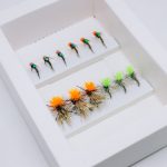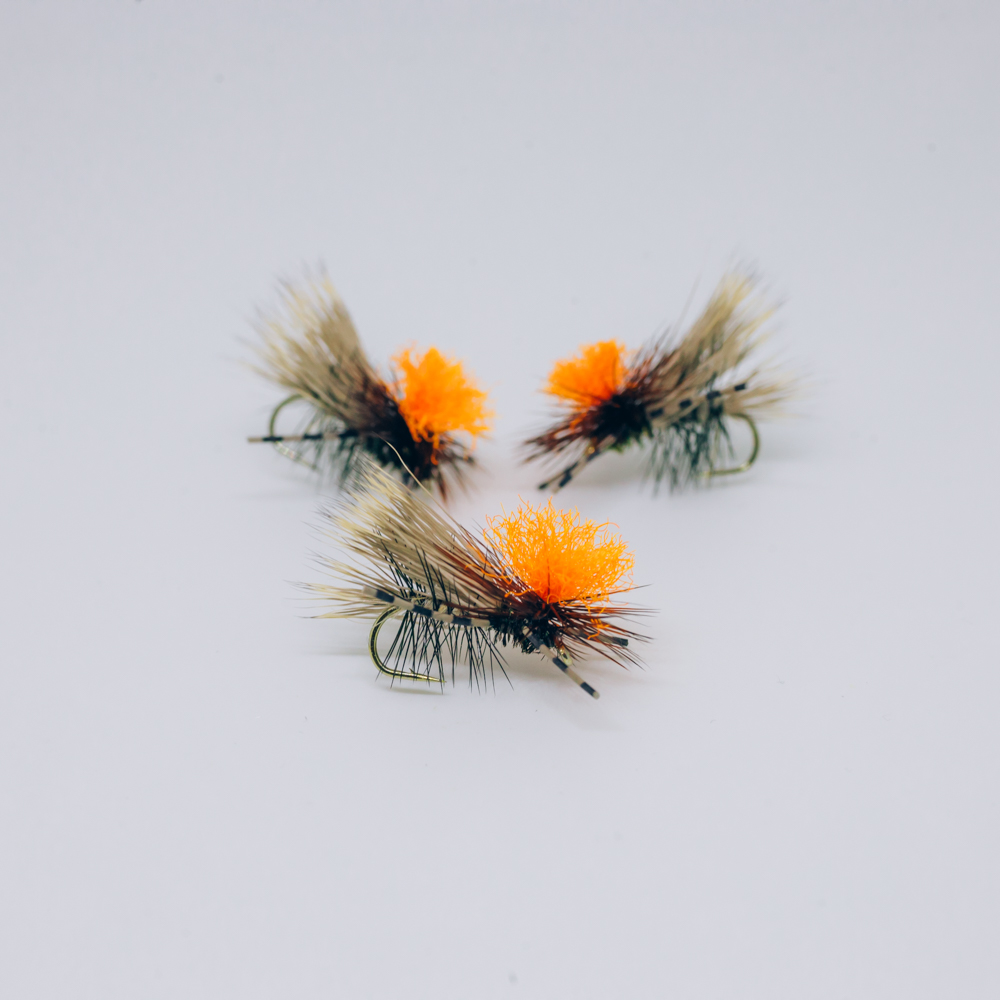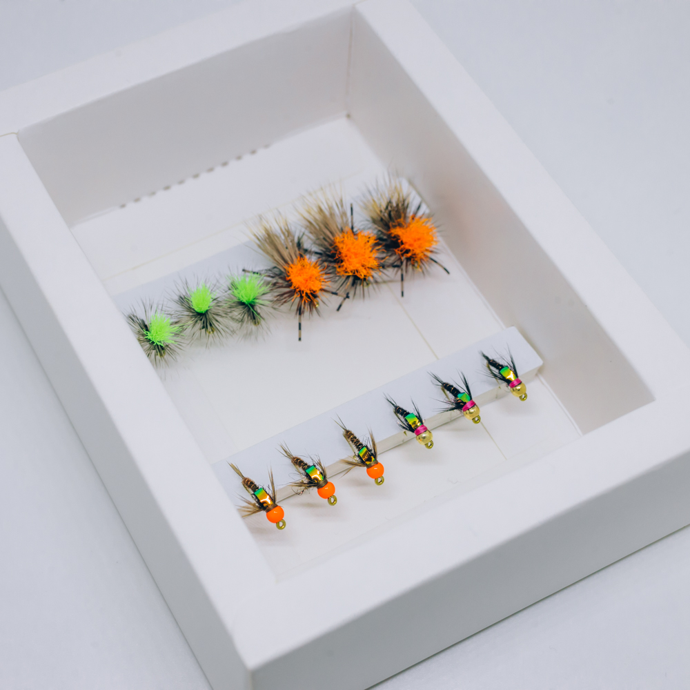Collection of hi-vis dry flies and hot spot nymphs that can be used as a dropper rig. Perfect combination for a murky water.