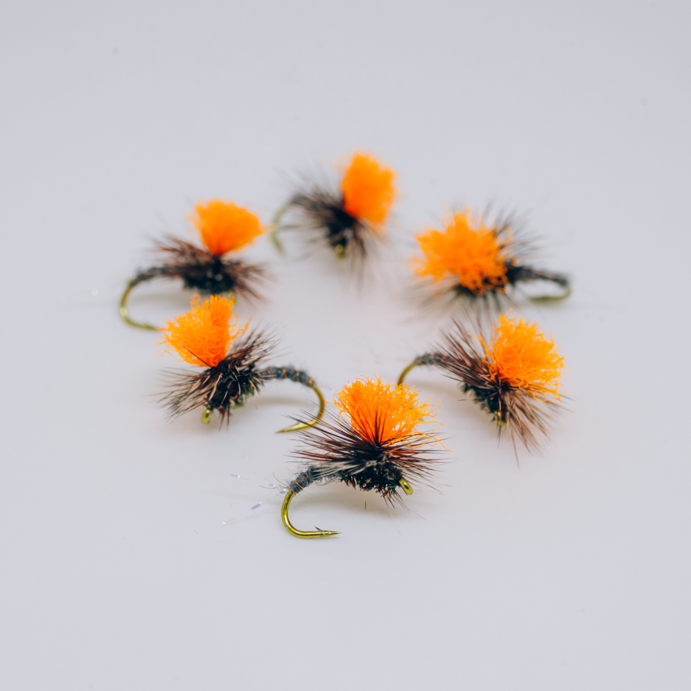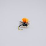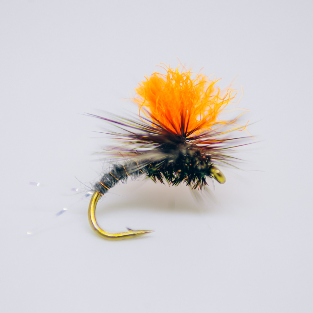 The classic Parachute Adams fly tied on a curved hook and with orange post for extra visibility. Flashy tail added in for the fly not be only visible to your but to the fish as well. Size 14.