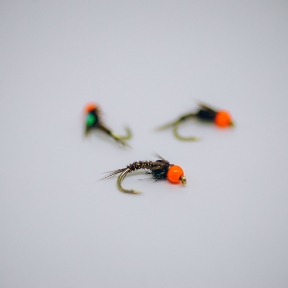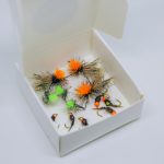 Collection of hi-vis dry flies and hot spot nymphs that can be used as a dropper rig. Perfect combination for a murky water.